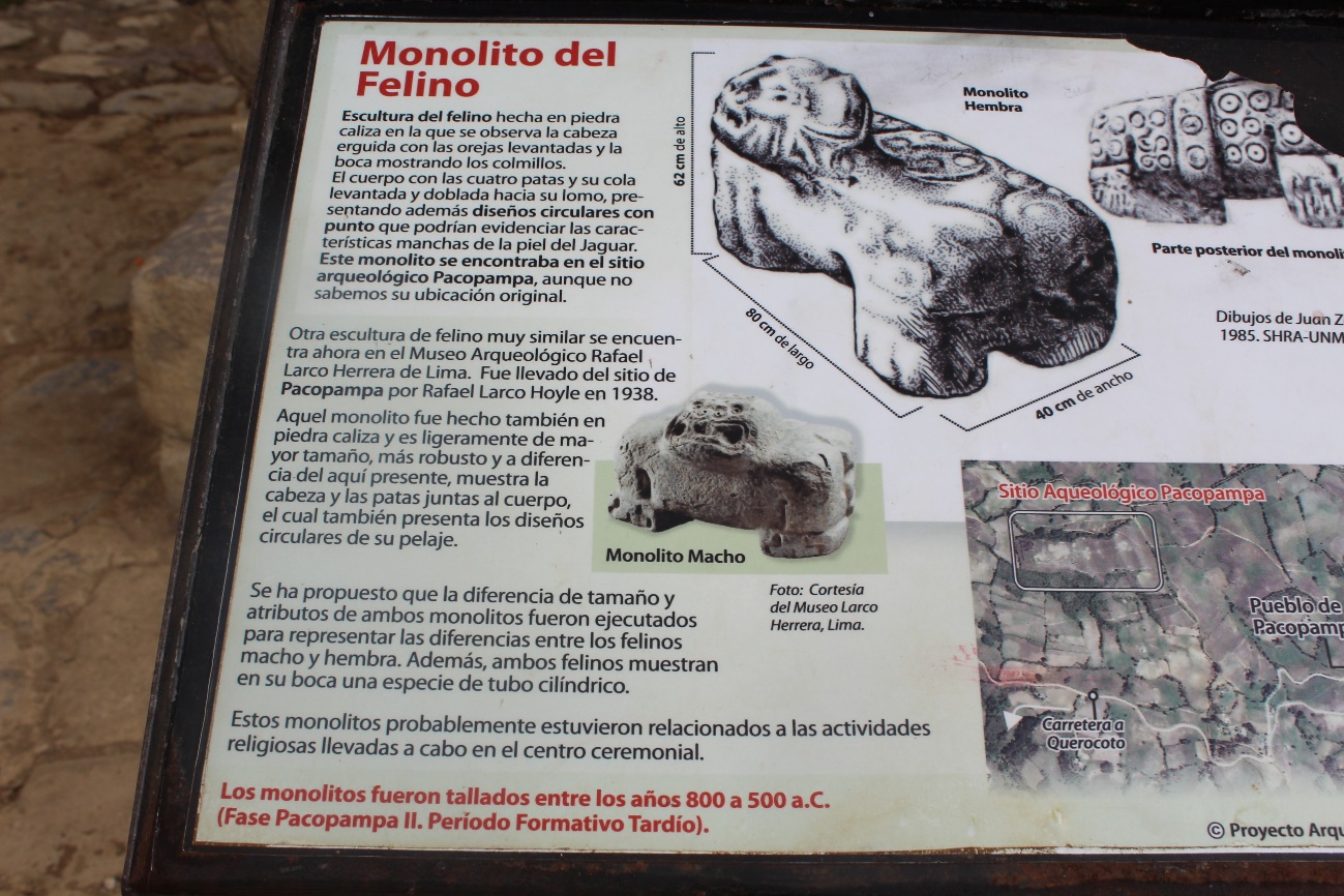 En Pacopampa fueron encontrados diversos Monolitos, son típicos los morteros de piedra con cuerpo de felino, también otros con cuerpo de felino con alas atadas a las ancas. Estas muestras de arte lítico se pueden apreciar en el museo Rafael Larco Herrera, las cuales fueron adquiridas por Rafael Larco Hoyle. Los mortero-felinos de Pacopampa están ornamentados con figuras simbólicas que les da la apariencia de jaguares. La ubicación estratégica de esta zona arqueológica permite observar el paisaje circundante y comunidades campesinas como Pacopampa hacia el este y la capital distrital Querocoto por el Norte. Las piedras labradas con las que se ha construido este complejo arqueológico son notables. La influencia Chavín de este lugar se aprecia en toda su magnitud, el modelo arquitectónico tiene parecido al templo de Kuntur Wasi en San Pablo.