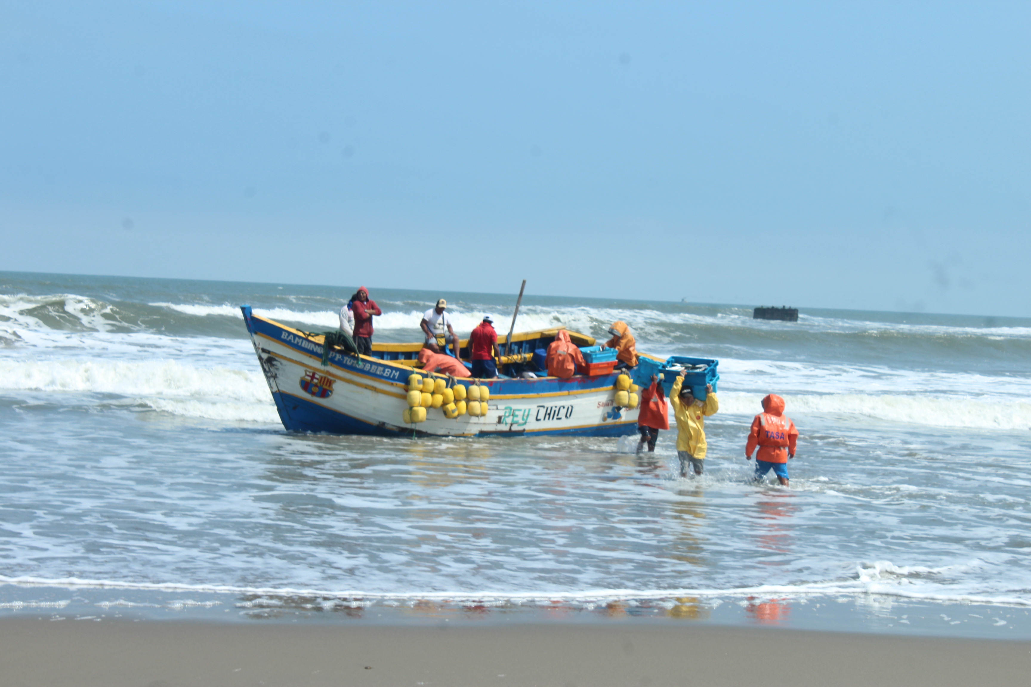 En Santa Rosa, por no presentar muelle, los productos de la pesca son desembarcados en la playa. Las embarcaciones al llegar al destino envían un cabo a tierra para asegurarla; luego jalan su boliche a la popa para que la embarcación no se maltrate al efecto del oleaje quedando perpendicular a la playa. Terminada la descarga la tripulación realiza la limpieza de su embarcación, y con ayuda del tractor típico en esta caleta, se hacen nuevamente a la mar, o suben la nave a la playa hasta cuando se realice un nuevo viaje.