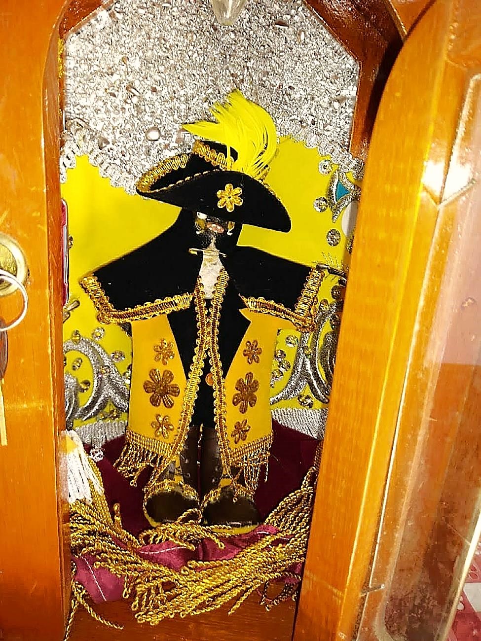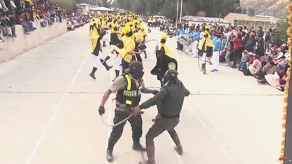 Vestimenta: Sombrero de color negro con plumaje; mascara de color negro con ojos saltados, saco negro, manto color rojo, pantalón amarillo o negro, látigo de cuero trenzado.