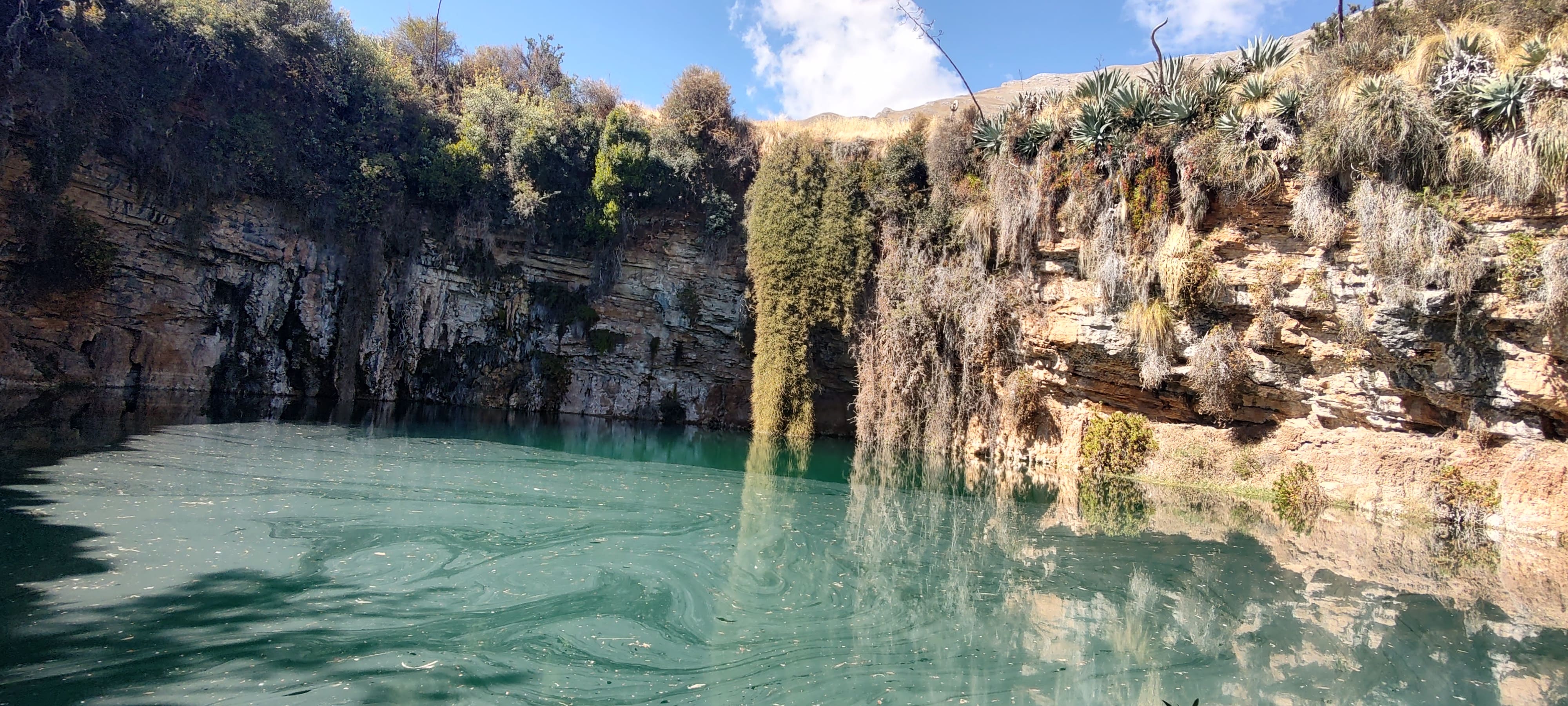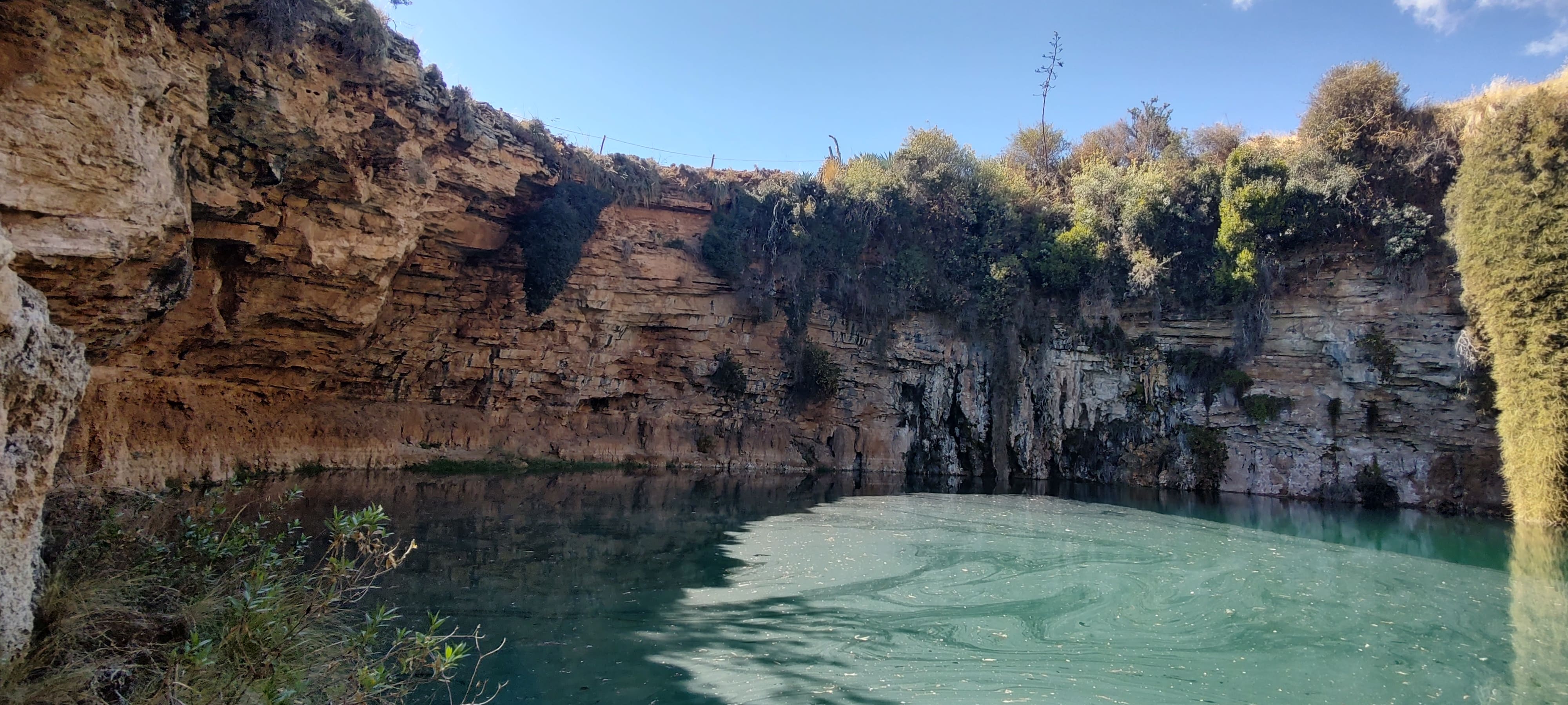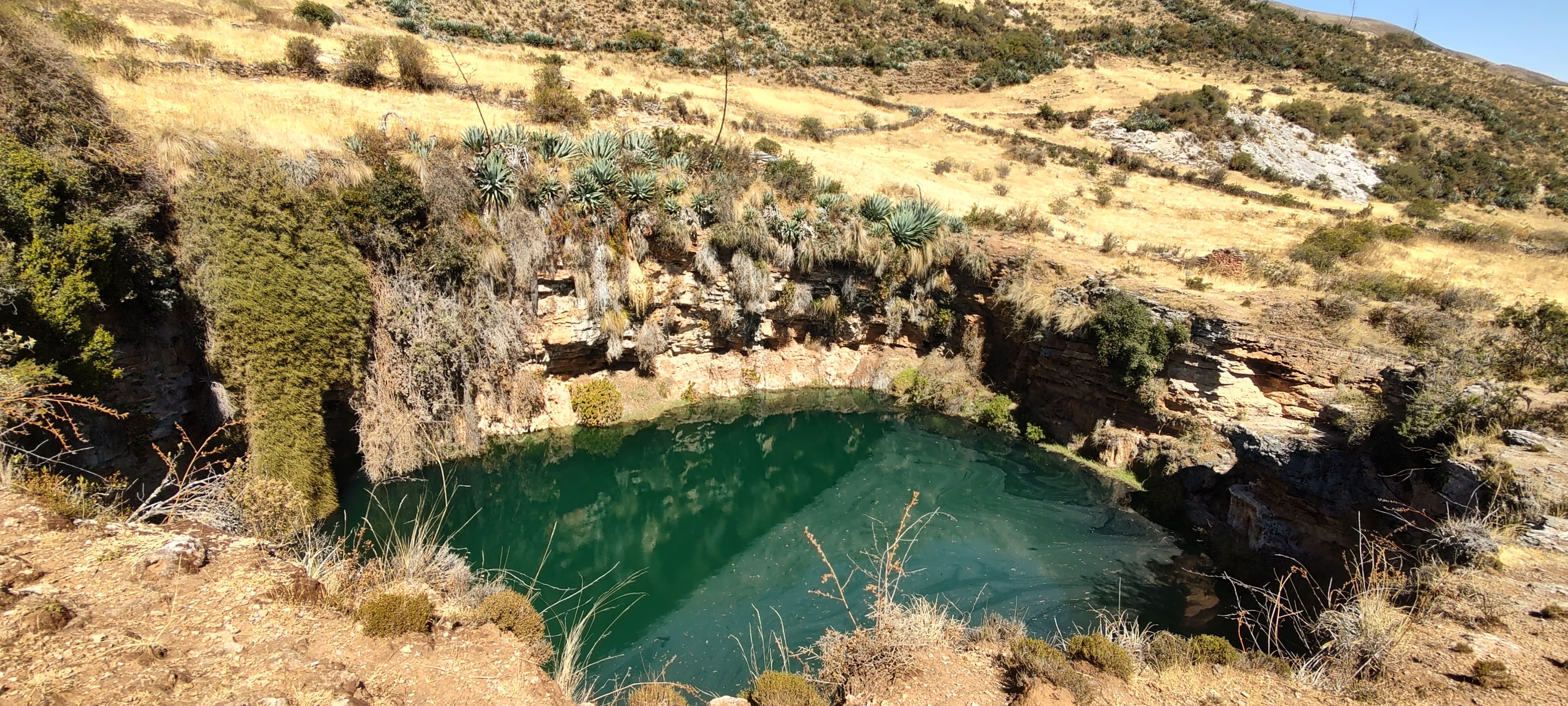 Según relatos orales de los comuneros de la zona, el cenote tiene una profundidad de 20 metros y sus aguas desembocan en el río Pampas, el cual se encuentra a pocos kilómetros de distancia.
