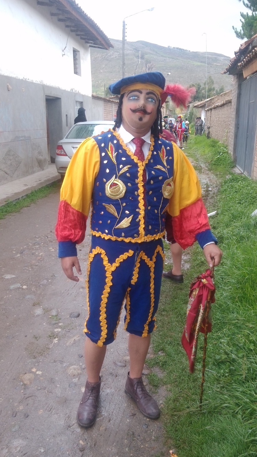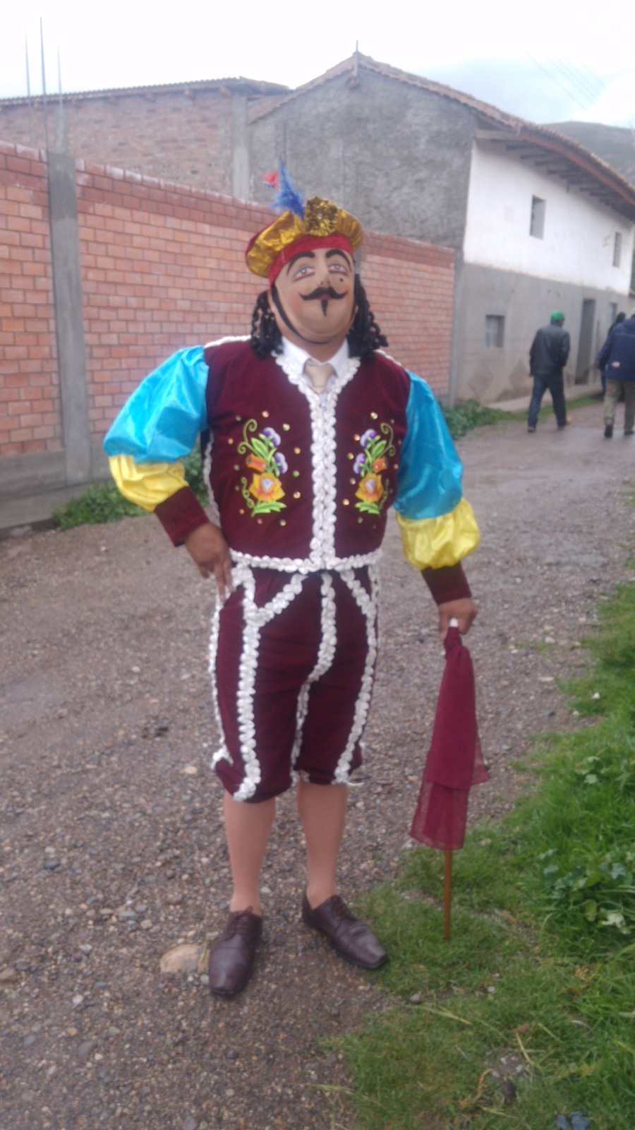 Netamente en la danza del corcovado huaripampino encontramos tres personajes principales. El “mayu” que representa a la autoridad local o comunal que lleva en la mano un látigo tejido de cuero de res denominado “zumba”, viste una chaquetilla y un pantalón corto, calzón o taleguilla de colores oscuros similar a la de los toreros, viste medias de seda y zapatos de cuero oscuro, el rostro lo tiene cubierto con una máscara de badana con una voluminosa cabellera rematado por una boina con pequeño moño. La “jaujina” es el personaje que representa a la dama local con vestimenta tradicional que acompaña al personaje del “español” que viste una camisa de seda en el fondo, una corbata sobre la cual porta una chaquetilla corta de lidia bordada y un pantalón corto o taleguilla similar también a la de los toreros, en la mano lleva un bastón que posiblemente representa el estoque o espada taurina.