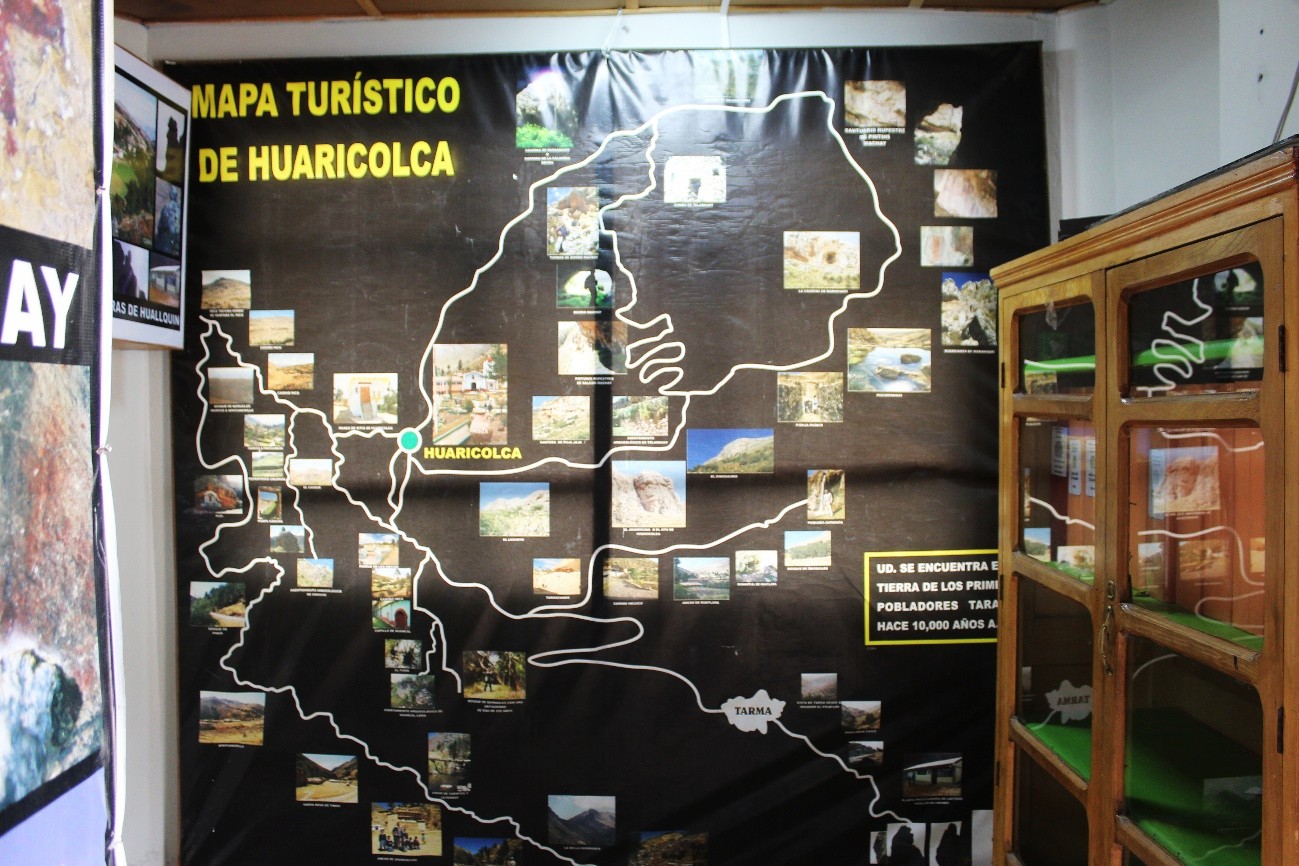 Funciona en un edificio de 02 pisos de material noble y techo de calamina construido por la Municipalidad Distrital, en terreno cedido por la Comunidad Campesina de Huaricolca; en el primer piso se ubican los servicios higiénicos y el almacén del museo; en el segundo piso se ubica la zona de exposición, donde se encuentran cuatro colecciones compuestas por diversos objetos encontrados en la jurisdicción del distrito, a través de los cuales se ha establecido una cronología que representa diversos periodos de la historia de Huaricolca. La primera colección es la de fósiles de amonites (moluscos cefalópodos extintos que existieron en los mares desde el Devónico Medio, hace 400 millones de años, hasta finales del Cretácico - 66 millones de años) contando con 102 fósiles de amonites, bivalvos y ostras; la segunda colección aborda el periodo Lítico Andino (primera etapa en la periodización cronológica de Luis Guillermo Lumbreras, que se extiende desde el arribo de las primeras poblaciones nómadas cazadores y recolectores, hasta el inicio de la domesticación de plantas y animales), en esta colección se encuentran diversos objetos como puntas de lanza, masas líticas, instrumentos rituales hechos de hueso de auquénido, instrumentos musicales de osamenta humana, entre otros. Estos objetos fueron encontrados en los abrigos rocosos de Balcón Machay y en el Santuario Rupestre de Pintish Machay; una tercera colección expone elementos pertenecientes al Horizonte Medio (período de las civilizaciones andinas entre el Intermedio Temprano y el Intermedio Tardío; para la mayoría de las cronologías propuestas, este período comienza en el 600 d. C. y termina en el 1000 d. C.), esta colección se incluye diversos objetos como cerámica, utensilios para el tejido, instrumentos para trepanaciones craneanas, osamentas humanas, cráneos humanos, trozos de fardos funerarios, utensilios para ceremonias rituales, entre otros elementos propios de la época de ocupación Huari, que fueron encontrados en el sitio arqueológico de Telarhuay y Balcón Machay, así como en los sitios arqueológicos de Marga Marga y Pacha Ñahuin; continua una colección que se asocia con el periodo denominado como Horizonte Tardío (espacio temporal de las civilizaciones andinas, caracterizado por el desarrollo del Imperio incaico, inmediatamente después del Intermedio Tardío; para las cronologías propuestas, este período comienza en el año 1438 y termina en 1532), en esta colección se incluye objetos de la época de ocupación Inca, encontrados en el tramo del Qapaq Ñan - Camino Inca, que cruza el distrito de Huaricolca y en diversos lugares del distrito donde se ha podido observar arquitectura Inca superpuesta a ocupaciones previas; finalmente existe 02 maniquíes que exponen la vestimenta de la “Danza de los Antis” tanto de mujer como de varón, que representa a los antiguos habitantes del Antisuyo (actualmente amazonía peruana). Destaca además una pieza que representa a un ídolo prehispánico, que se encuentra en el centro de la sala principal, esta figura denominada "Javaricuna" de 12 cm de alto por ½ pulgada de grosor, fue una deidad adorada en el espacio geográfico de lo que actualmente es Huaricolca, con una zona de influencia que se extendía por gran parte de lo que hoy es la provincia de Tarma; presenta tres caras y una corona, hecha de hueso, presumiblemente humano. El museo cuenta asimismo con un mapa turístico del distrito de Huaricolca, donde se señalan los principales sitios arqueológicos y turísticos ofrecidos a los visitantes por parte del gobierno local; asimismo, cuenta con un libro de registro de visitas y en sus instalaciones se puede solicitar el servicio de una persona que lo conducirá hacia los lugares de interés arqueológico. Este museo es parte de la “Guía de Museos e Instituciones Museales del Perú” del Ministerio de Cultura.