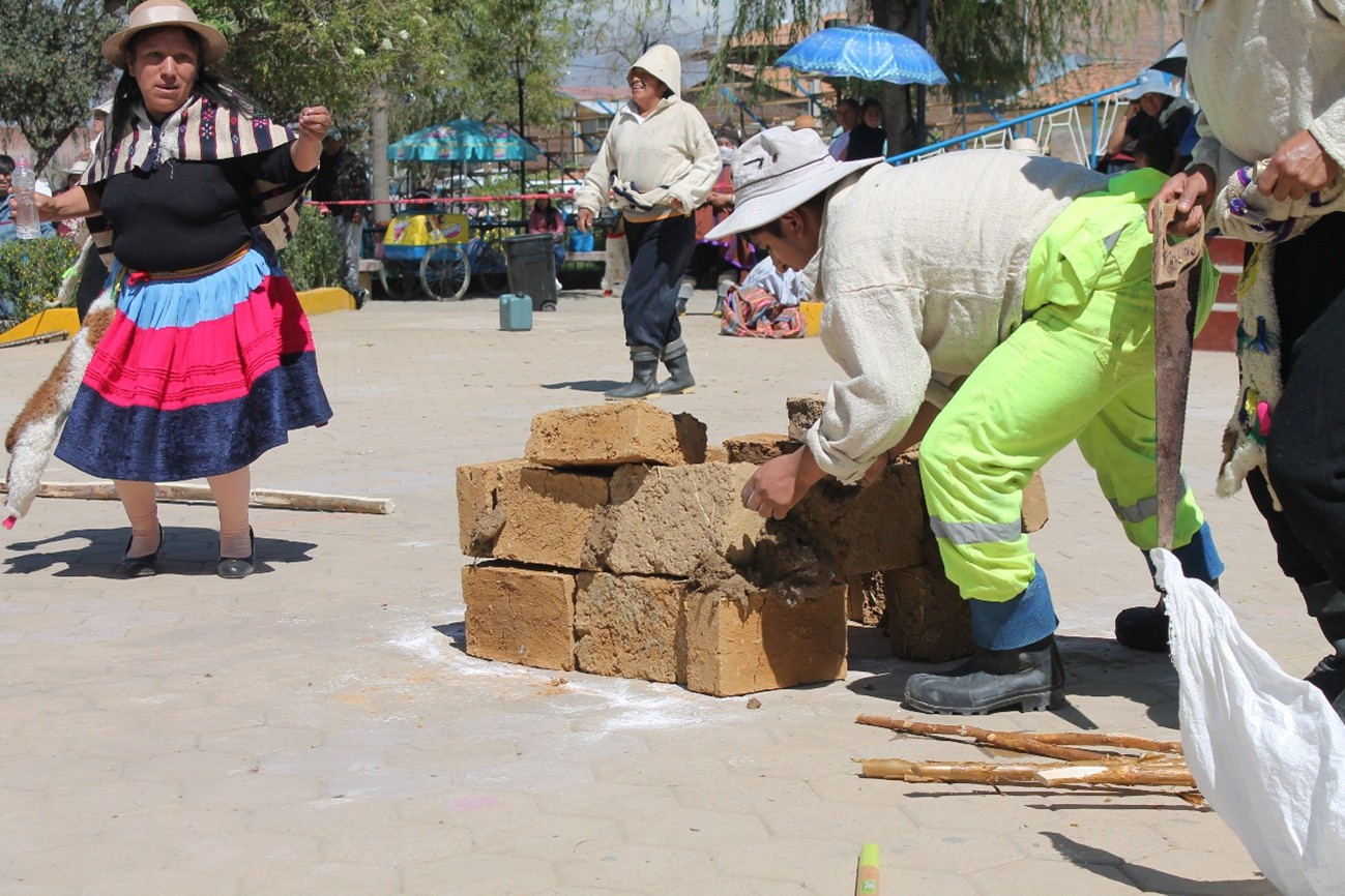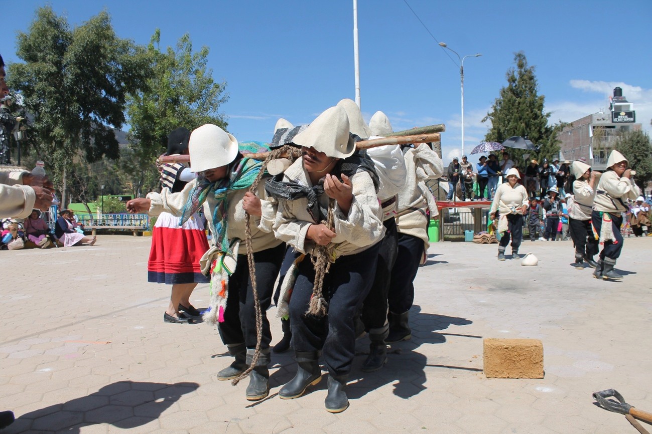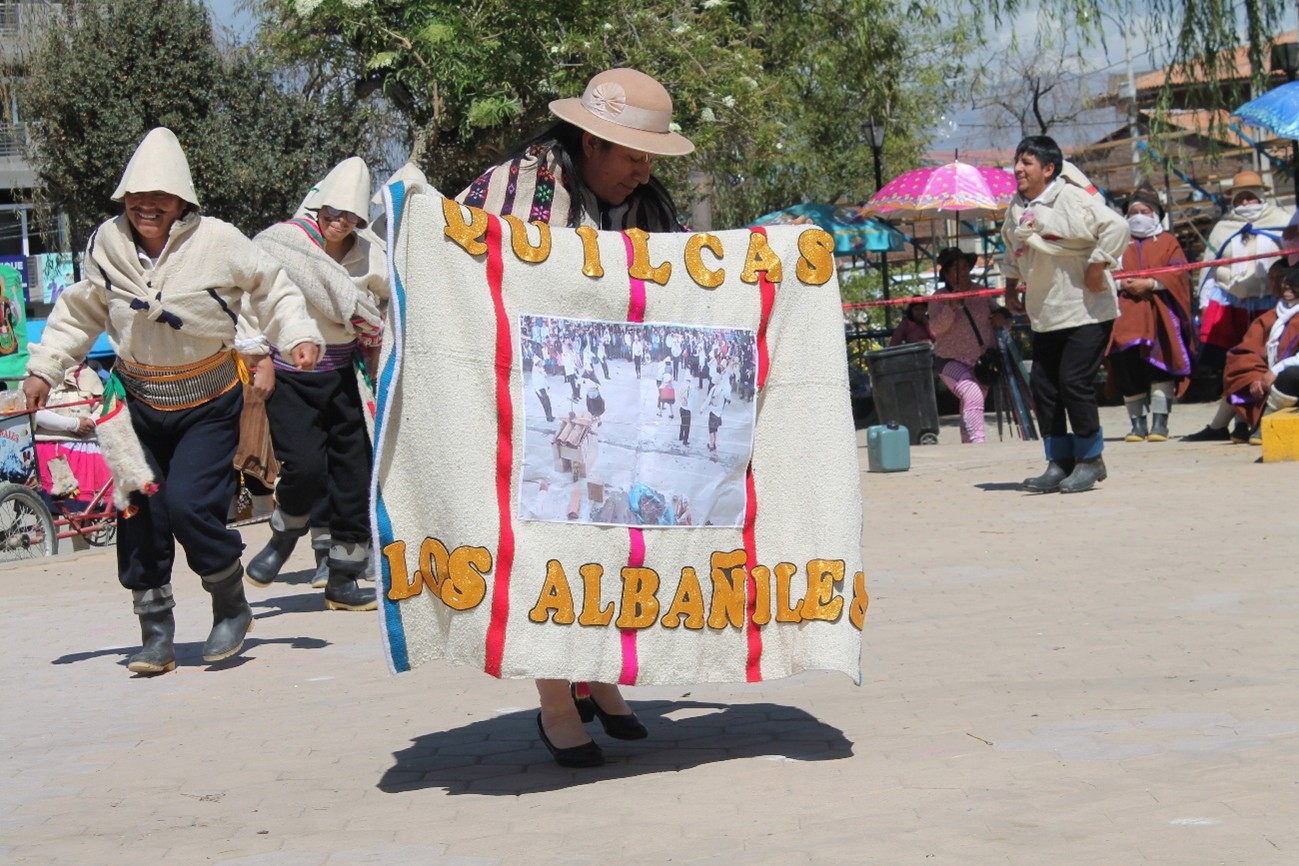 La Danza de los Albañiles, autóctona del distrito de Quilcas, es una representación que ilustra el proceso de construcción de una vivienda típica, desde la cimentación hasta el techado. Esta danza celebra la habilidad y el esfuerzo de los albañiles en cada etapa del proceso constructivo, destacando su importancia en la creación de viviendas y otras edificaciones de la localidad; tradicionalmente se baila en el barrio “Santa Cruz” en el pueblo de Quilcas, siendo ejecutada por primera vez el año de 1952, coincidiendo con la celebración realizada por la “Creación política del distrito de Quilcas”. En aquellos años, el barrio de “Santa Cruz” abarcaba también lo que hoy se conoce como el barrio “27 de Mayo” y que, de acuerdo a la tradición oral recopilada de antiguos pobladores, fue en ese sector del barrio, donde esta danza comenzó a tomar forma, inspirándose en el trabajo diario y esforzado de los albañiles locales. En cuanto al vestuario, las mujeres utilizan polleras de color rojo al medio, con franjas azul marino o crema en la parte superior y azul oscuro en la parte inferior, junto a una cinta o ribete que se utiliza para ajustar la falda; blusa oscura y lliclla (hombrera rectangular) blanca con franjas oscuras adornadas con diseño florido, sujetada con imperdible, chuco (gorro de lana de oveja) de color negro y en algunos casos sombrero wanka de color marrón claro con cinta de agua de tonalidad similar y huallqui (bolso de piel de oveja recién nacida); el varón viste camisa blanca y pantalón negro, ambos de bayeta, botas de gebe, algunos llevan una faja tejida y otros una pullocata (manta de lana de oveja) amarrada a la cintura, además de un huallqui (bolso de piel de oveja recién nacida); además de un varón vestido de “obrero moderno” que representa al maestro de obra; otro denominado “el oso” cubierto de pies a cabeza con pellejo de oveja y que en la danza aparece cerca al final llevando chicha de jora y simbolizando la conexión de los albañiles con las zonas alto andinas. A nivel coreográfico la danza expresa de forma teatral y simbólica cada etapa del proceso constructivo: desde la cimentación, levantamiento de paredes, hasta el colocado del techo, con materiales tradicionales como el adobe y las tejas; siendo una puesta en escena de la habilidad, coordinación y fuerza de quienes, con sus manos, levantan las casas para sus familias; toda la escenificación del proceso de construcción se baila al compás de ritmos de la herranza tradicional del valle del Mantaro, usando instrumentos como el violín andino y tinya (instrumento andino de percusión similar a un tambor) además de una cantora, aunque en años recientes también son acompañados por orquestas santiagueras compuestas por saxofón, clarinete y tinya moderna. Los pasos consisten en zapateos y baile en parejas, similar a los ejecutados en la Herranza y danza del Santiago, mientras que el personaje que simboliza al maestro de obra realiza el delineado en el suelo de la futura casa y guía a los varones en las sucesivas etapas de construcción; tiene pausas donde todos los bailantes se sientan en circulo para realizar la “mishkypa” donde se reparte coca y se mastica, se toma caña y encienden sus cigarros, representando tradiciones ancestrales de trabajo comunal o “Wajete” para la construcción de las viviendas de los comuneros. De esta manera, la danza de los “Albañiles de Quilcas” simboliza en cada movimiento, cada herramienta, cada gesto, la complejidad y dignidad del oficio de construir, la coreografía y costumbres presentadas se entrelazan como los adobes en una pared, siendo en palabras de antiguos comuneros de Quilcas “firmes, coordinados y llenos de significado”; puesto que los danzantes de los “Albañiles” no solo edifican casas, también construyen memoria, identidad y comunidad a través del arte.