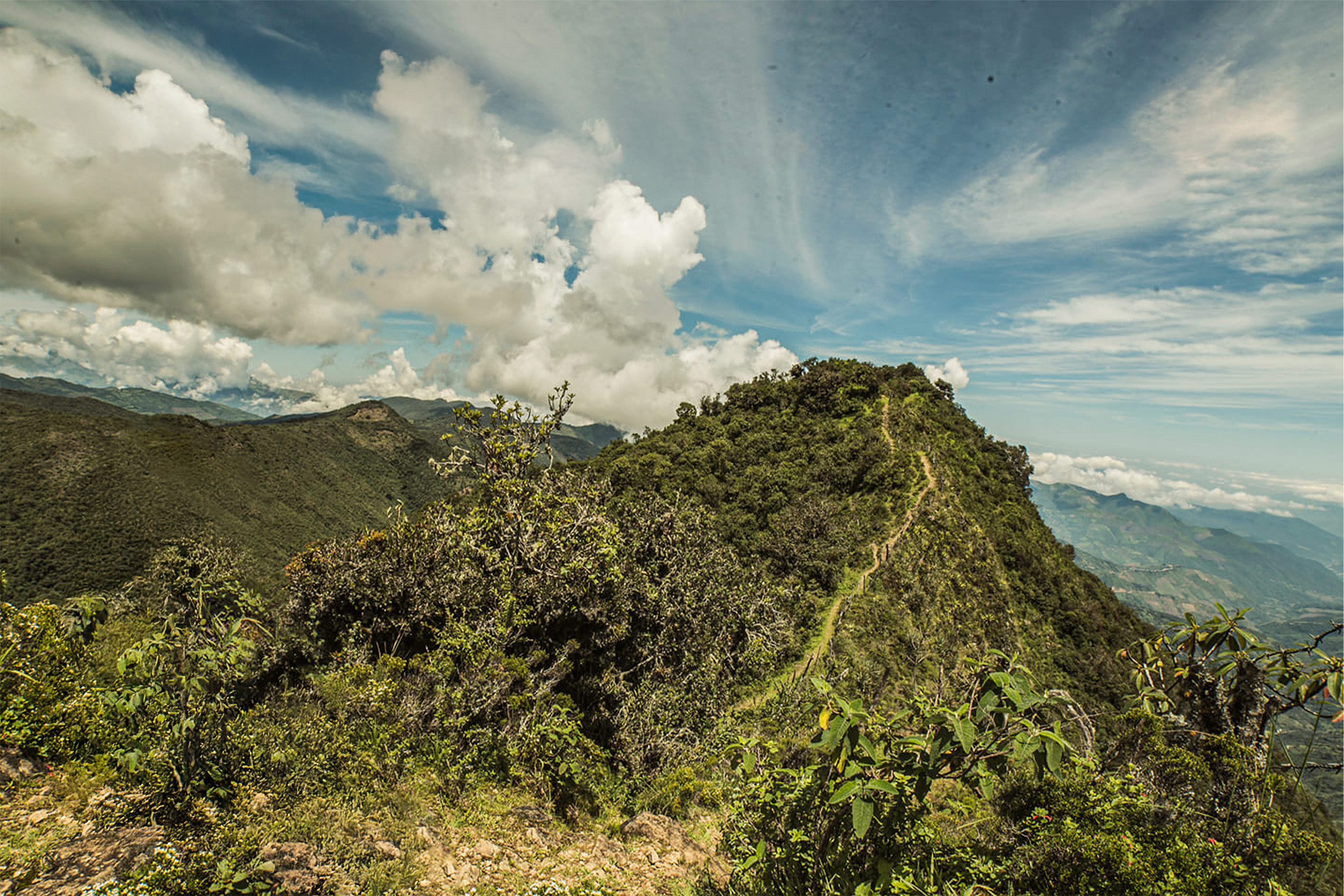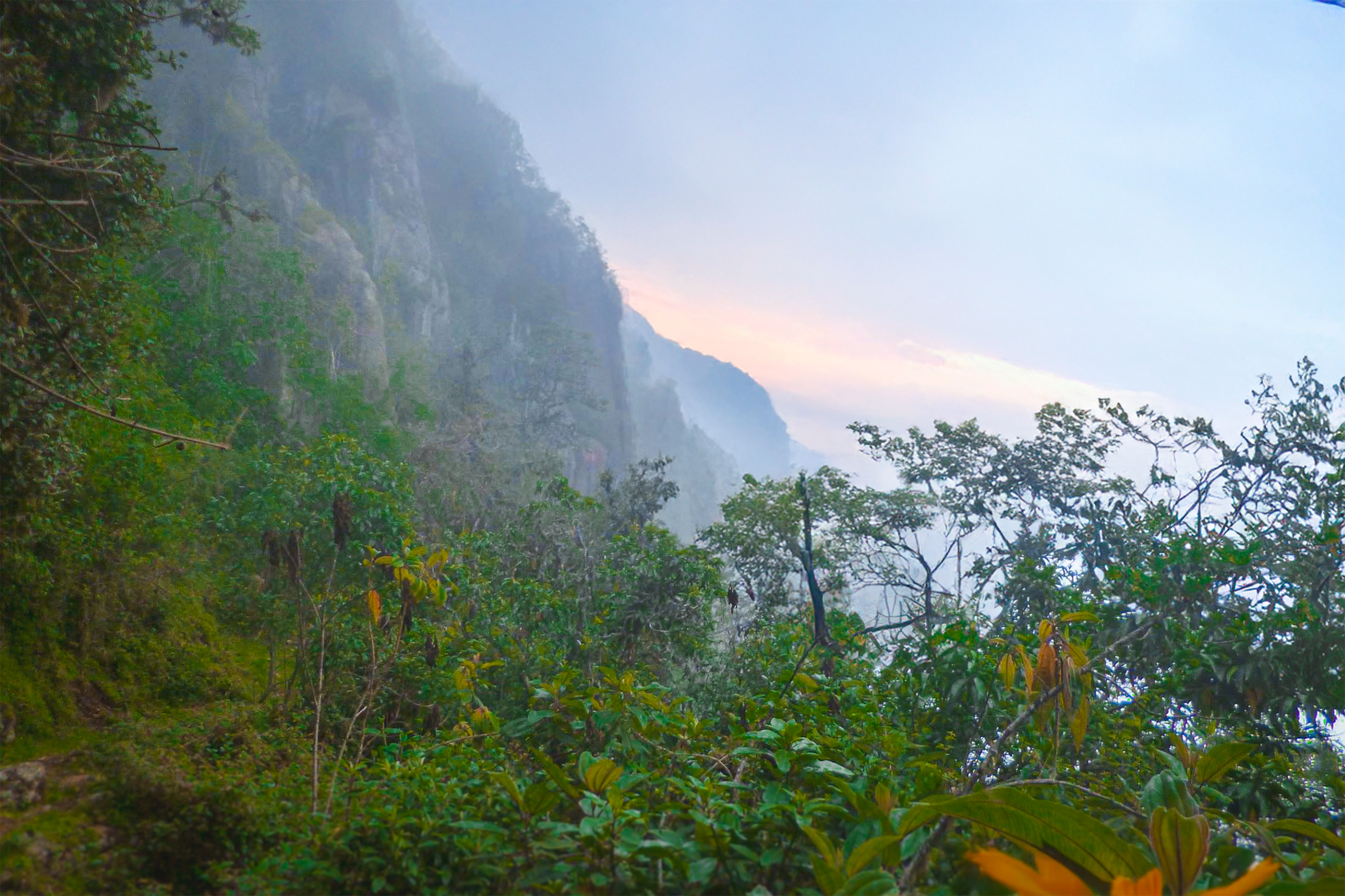 En la ladera occidental se desarrolla un bosque de neblina denso y exuberante, caracterizado por una alta humedad relativa y una biodiversidad notable. A lo largo de más de 1500 metros de desnivel altitudinal, se distinguen diversos pisos biogeográficos. Entre las especies arbóreas destacan ejemplares de cedro (Cedrela sp.) y ceibo (Erythrina sp.), mientras que la fauna incluye zorros, conejos silvestres y venado cola blanca.