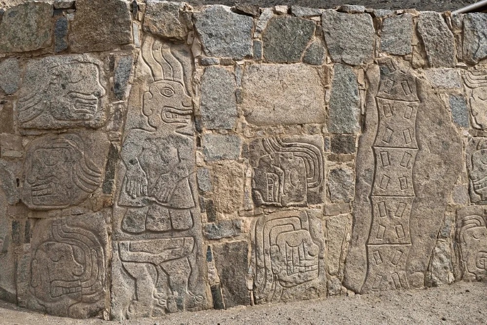 El Complejo Arqueológico cuenta con una gran cantidad de esculturas líticas (piedras grabadas) en su muro perimetral.
