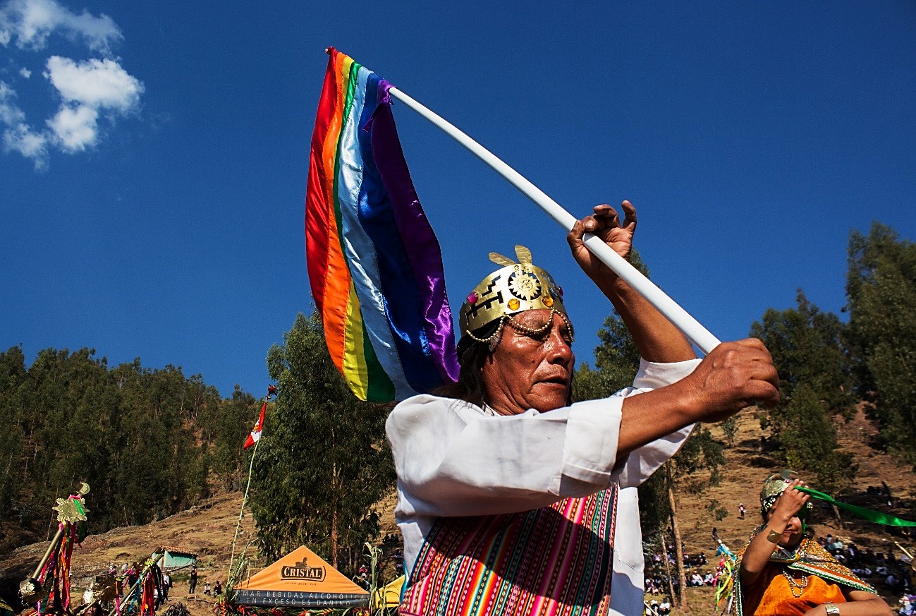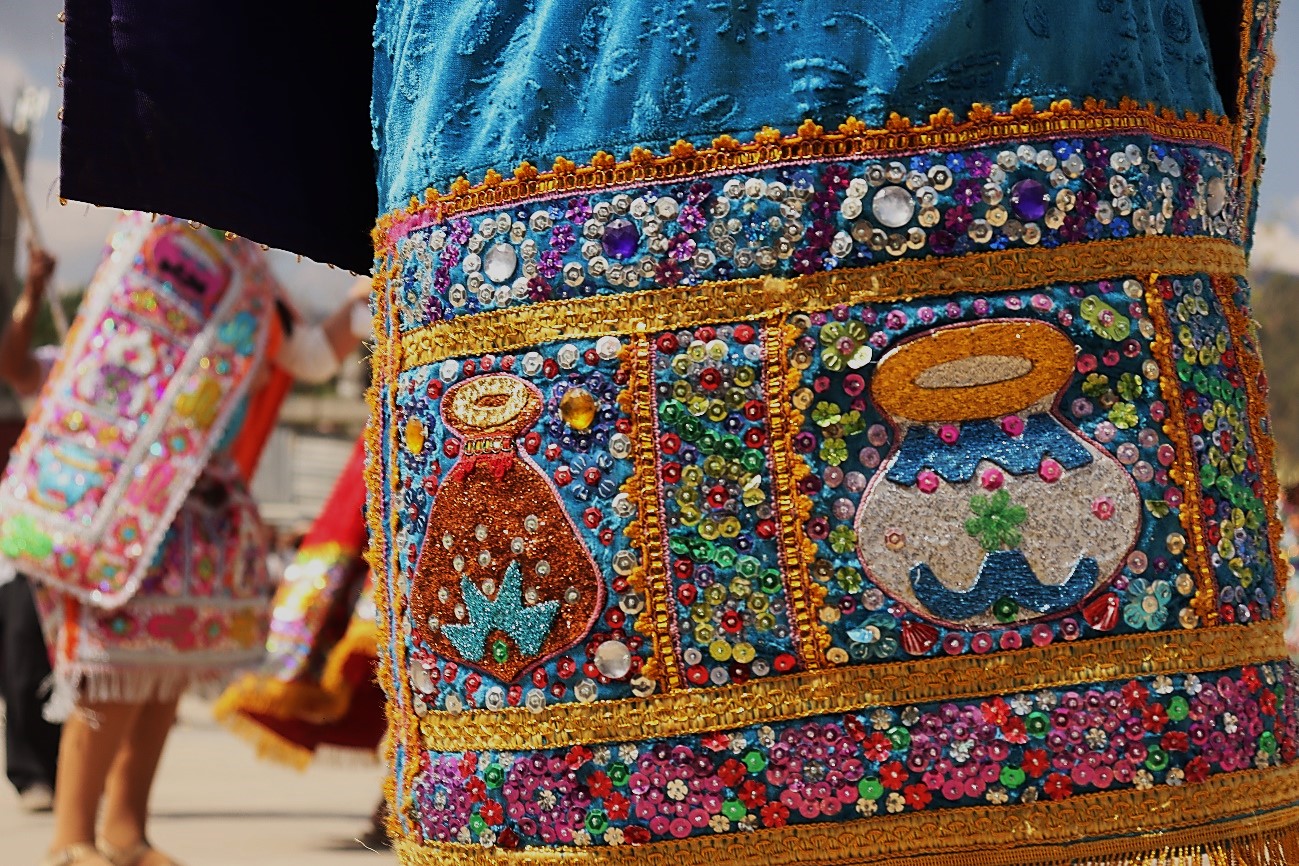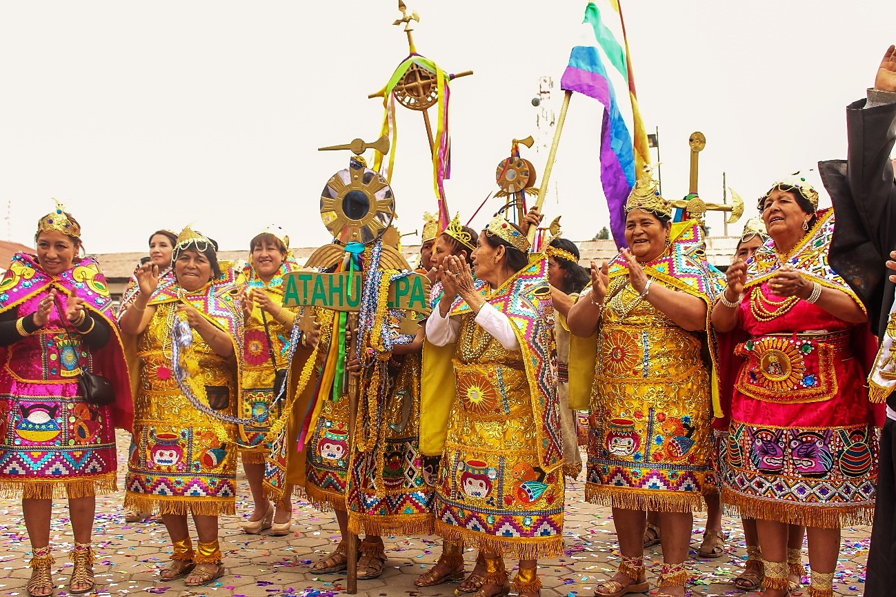 El Vestuario: INCA, mascaipacha de oro (diadema en la frente), yacolla, manto bordado con hilos de oro sobre la espalda, cushma o uncu (túnica), chumpi (faja), túpac yauri o caspi: asta de oro de gran longitud que porta el inca en la mano derecha, de cuya punta bajan dos cintas que llevan las pallas; chipana, brazalete en las muñecas; uxutas (sandalias). PALLAS y ÑUSTAS: pillu, corona en la cabeza; uncu, túnica bordada; lliclla, manto corto; chipana, brazalete en las muñecas. AUQUIS: atuendo idéntico al del inca, sin escolta. CAHUIDES, vincha alrededor de la cabeza; cushma, túnica de menos lujo que de los nobles; yacolla, manto corto; chuspa, bolsa multicolor; pullccanca, escudo que lleva en la mano izquierda y porra en la mano derecha; uxutas (sandalias) y cintas multicolores que contornean las piernas. CHASQUIS, llevan vincha, camisa blanca, una ushcata (bolsa) a la bandolera; calzón tipo español con sobre bordaduras; uxutas. CUSQUEÑAS, vestimenta semejante al de las campesinas actuales del Cusco. CHUTOS, atuendo parecido al que llevan los indígenas en el sur del Perú. FELIPILLO, atuendo idéntico al del chuto, con la diferencia que porta una gran bandera del Tahuantinsuyo. ESPAÑOLES, casco en la cabeza, peluca, bigotes y barbas, coraza sobre el pecho, pantalón bombacho, medias color carne y espada. FRAY VALVERDE, sotana, bonete en la cabeza, una Biblia en la mano izquierda y Cruz en la derecha.