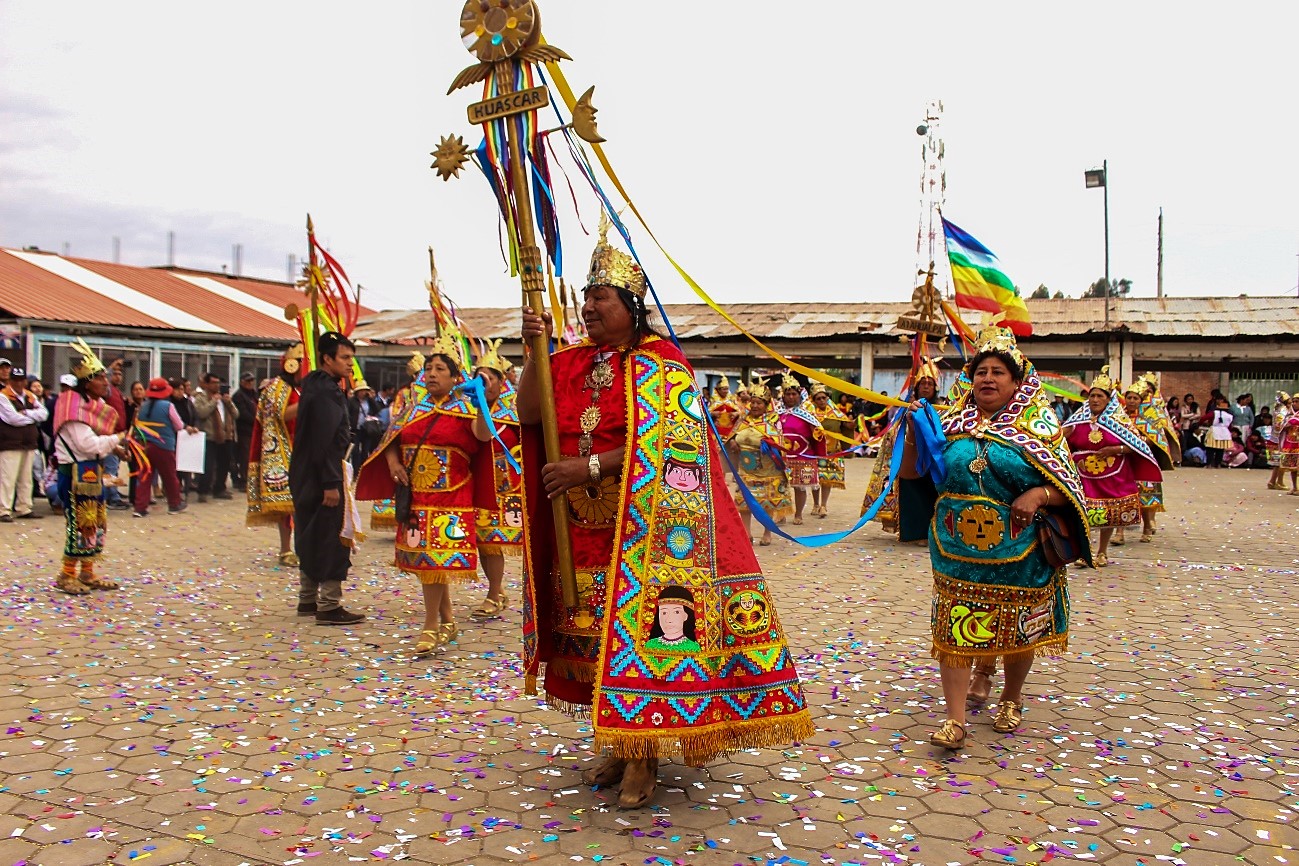 La CORTE INCAICA conformada por el “Apu Inca”, representado por un personaje de facción andina recia; Pallas, damas nobles de hermosas facciones a cada lado del inca; Ñustas, princesas van detrás de las pallas; Auquis, príncipes que siguen a las ñustas; Cahuides, guardia del inca; Cusqueñas, mujeres de servicio; Chutos, yanas o sirvientes. COMITIVA HISPANA, integrada por “Pizarro el Conquistador” personaje de facción hispana en ocasiones hace su aparición montado a caballo; Soldados españoles, que siguen a Pizarro; Cura, representa a Fray Valverde; Felipillo, el indígena traidor.