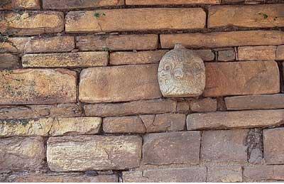 En su exterior se ubica una cabeza clava, el cual fue tallada en toba volcánica, en caliza y en arenisca.