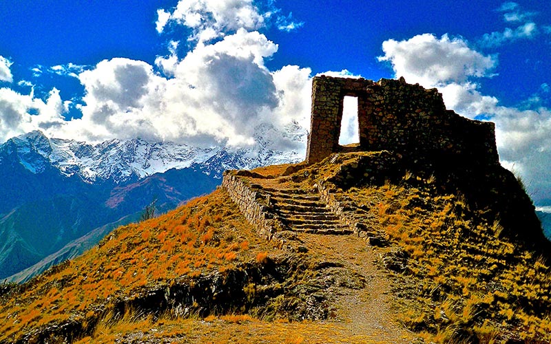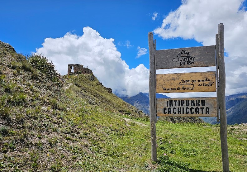 La puerta del sol está ubicado a 9 km. Inti Punku, es una palabra que deriva del quechua, que se traduce como “Puerta del Sol”, desde esta puerta, obra hecha a base de piedras se puede apreciar el Nevado de la Verónica (5800 m.s.n.m.). Se halla conformado por vano de forma trapezoidal de 3.05 metros de altura aproximada, construido a base de piedra devastada y mortero de barro, como atributos arquitectónicos presenta una hornacina hacia el lado oeste y dos orificios a un metro del nivel de piso que sirven como encerramiento de la puerta, comprensión de la comunidad de Kachiqhata, el vano está orientado al Norte. Por los atributos arquitectónicos como la trapezoidalidad de las jambas, corresponde a la época inka, probablemente de uso ceremonial. Se trata de un mirador astronómico y estratégico construido por los Incas utilizado como una especie de torre de vigilancia de las rutas de acceso a Machu Picchu, desde la selva amazónica al otro lado de las montañas desde esta puerta, posiblemente, hubiera sido construido con el fin den ser un espacio ceremonial; esta finalidad del complejo se vería sustentada tanto por la ubicación de este, como por la orientación que presenta una plataforma descubierta en aquel. Pese a que el fin ceremonial de Inti Punku prima entre las hipótesis que este lugar presenta, se presume también que este sitio podría haber respondido a fines militares,