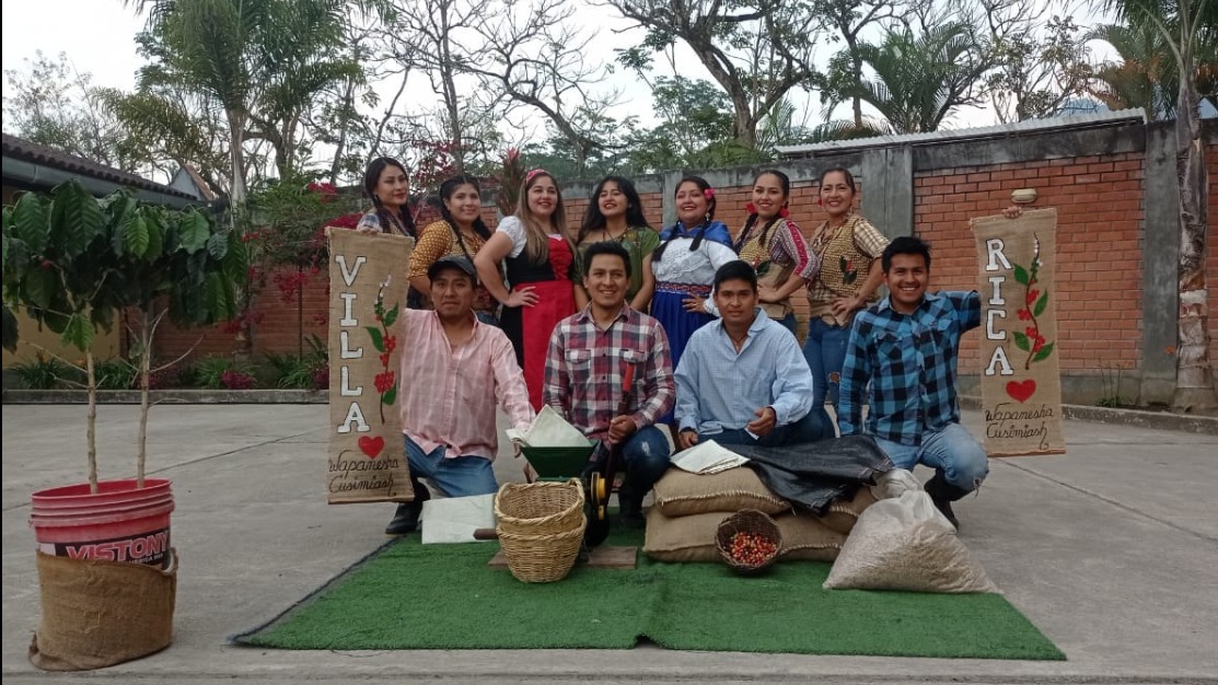 Esta danza es representada por mujeres Yaneshas, que visten con una Kushma y vestuarios elaborados a base de la Tela Tocuyo teñida con tintes naturales del Bosque, mujer Andina, que viste su traje típico con una falda, blusa, manto y sombrero; Los Colonos austroalemanes quienes visten con una falda, un mandil, una blusa blanca, caficultores y cosechadores cuya vestimenta en las mujeres consiste de una blusa blanca, pantalón jeans, ballerinas negras, un chaleco y cinturón elaborado con tela de yute en representación a los sacos de café con unos hermosos adornos a base de los granos, un peinado recogido (trenzas) sujetadas con cintas delgadas de colores que simbolizan la bandera del distrito de Villa Rica verde, blanco, amarillo y morado. Los varones visten la imitación de un cosechador de café, una camisa a cuadro, pantalón, jeans, botas de jebe y un pequeño morral, personajes unidos por la pasión y el trabajo por el café.