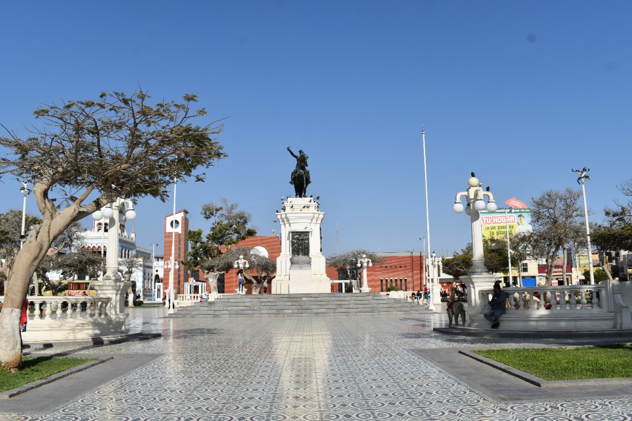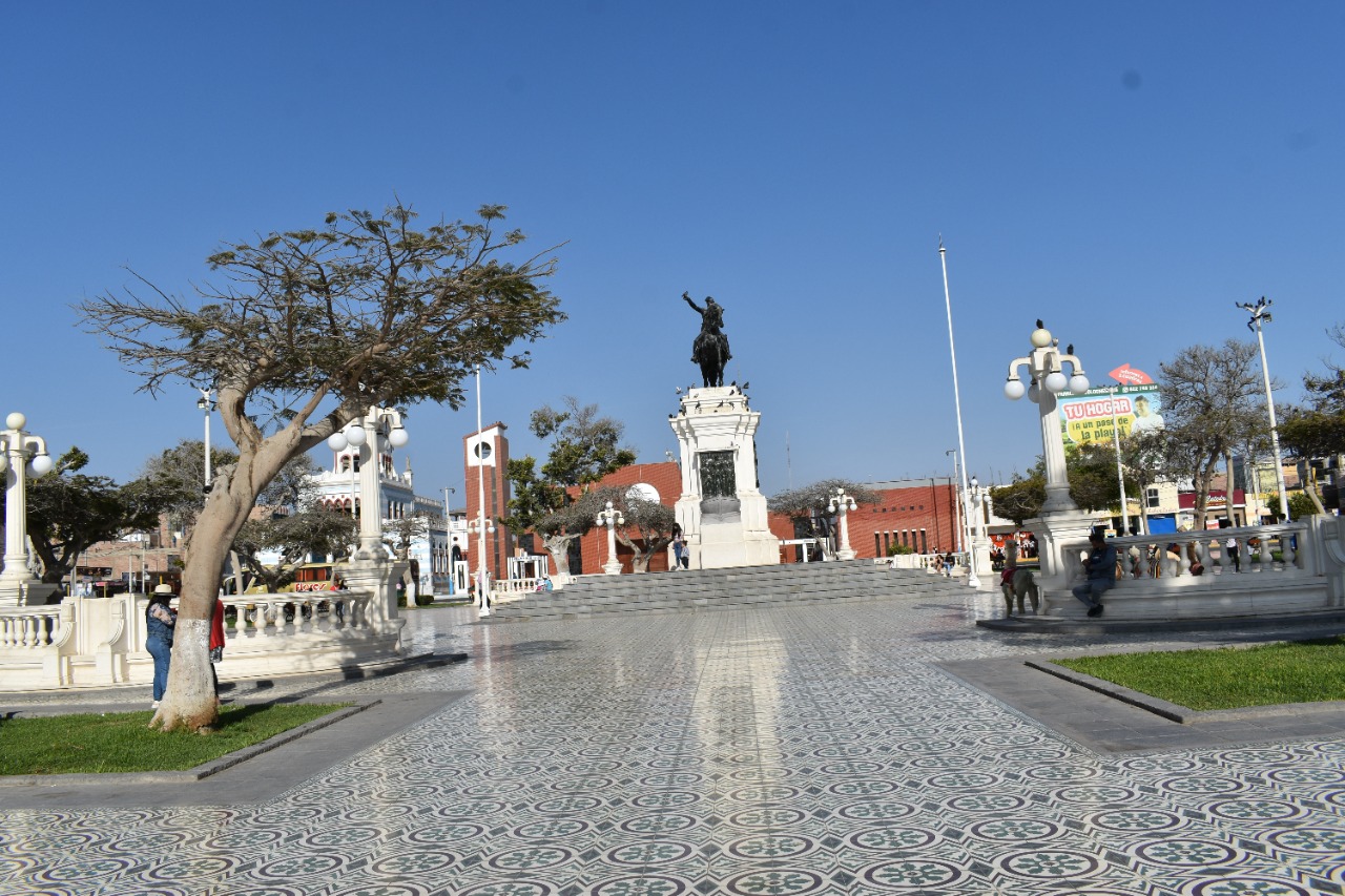 Una gran parte de la Plaza de Armas fue destruida debido al terremoto ocurrido en el 2007, sin embargo, aún se mantienen algunas de sus notables estructuras de antaño; mientras que otros fueron reconstruidos con la misma forma que sus predecesoras. Algunos de los objetos que se puede apreciar es la estatua del libertador revolucionario sudamericano José de San Martín, esculpido en bronce por el artista pisqueño José Luis Peña y Peña. En la parte inferior se encuentra una placa de bronce que muestra el decreto con el que se crea la primera bandera del Perú, símbolo de la Patria, inspirado en el ambiente y paisaje pisqueño. Fue Declarado Ambiente Urbano Monumental el 27 de noviembre de 1985 con Resolución Ministerial N.1251-85.