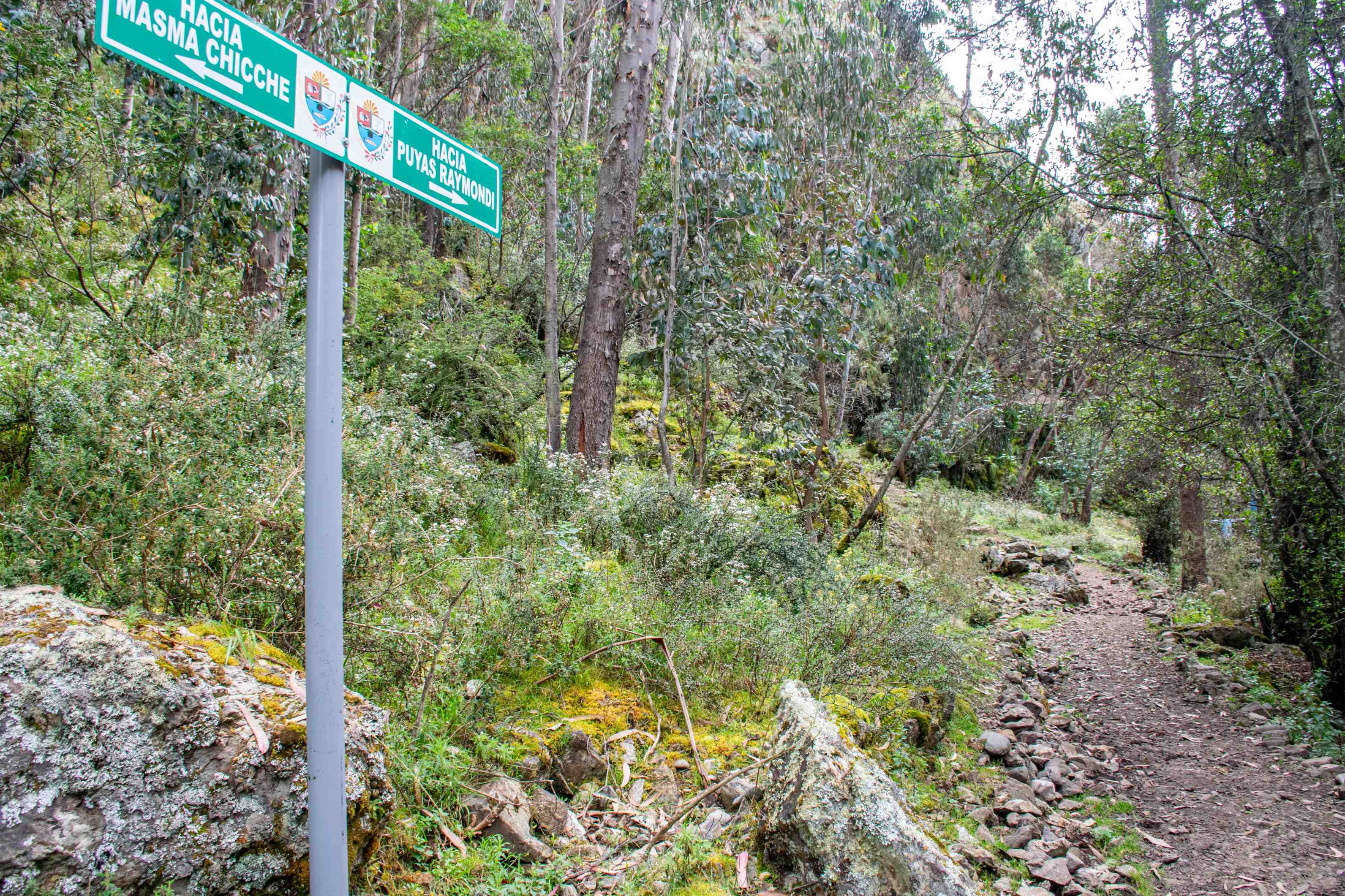 El recorrido más atrayente se inicia en la plazuela del barrio El Progreso por un sendero de 2 m de ancho en promedio con descansos ubicados cada cierto tramo, habilitados por la comunidad y señalizado hasta el bosque de puyas, ascendiéndose río arriba en una caminata de dificultad media con un desnivel ascendente de 200 metros (3700 a 3900 m.s.n.m.) pasando por parajes pintorescos cubiertos de árboles de aliso (Alnus acuminata ssp.), eucalipto (Eucalyptus globulus) y quinual (Polylepis spp.). También se puede observar especies de arbustos nativos como el chachacomo (Escallonia resinosa), tasta (Escallonia myrtilloides), mutuy (Cassia Tomentosa), taya (Baccharis buxifolia) y chijchi (Berberis lutea). La abundante flora altoandina resalta en todo el recorrido, destacando especies florales como como el zapatito del diablo (Calceolaria crenata) y amor seco (Bidens andicola); plantas aromáticas como el hualamacay o marmaquilla y la pacha salvia (Lepechinia meyenii), plantas medicinales como la ortiga o ishanka, qera (Lupus tacunensis) también abundan frutos silvestres como la macha macha (Gaultheria myrsinoides), llenllencosh (Gaultheria glomerata) y chujulumpa. La zona de mayor atractivo, cuenta con la presencia de dos especies de puyas, una de menor tamaño conocidas localmente como marja o maqra que se encuentran en todo el recorrido, no obstante, destaca el rodal o bosque de puyas de Raimondi gigantes (Puya raimondii Harms) conocida como “titanka”, especie que se encuentra categorizada “en Peligro” de extinción. Según los últimos estudios realizados se ha contabilizado 5,563 ejemplares con una densidad poblacional de 327 individuos por hectárea distribuidas en tres sectores. La titanka es la bromelia con mayor altura, considerando que su inflorescencia puede llegar a medir hasta 15 m; es monocarpica, pues una vez que la planta florece y fructifica, produce de 6 a 10 millones de semillas para finalmente morir cumpliendo un ciclo de vida de 40 a 100 años. Las puyas de Masma Chicche, a diferencia de especies de otras zonas, florecen en colores morado y turquesa lo que lo hace más llamativo, asimismo cabe recalcar que el bosque de puyas de esta zona presenta una estructura poblacional en expansión ya que en los tres sectores de estudio predominan en un 70 %, individuos con altura menor a 0.5 metros y se encuentran en proceso de crecimiento. La variada vegetación descrita es hábitat de una variada avifauna como el cuculí, gavilán, cernícalo o quillicha, búho o tuku, pito o akaqlluy (Colaptes rupícola), chiguaco, huaychao, ucushpishqu, pichuichanca y jacharas.
