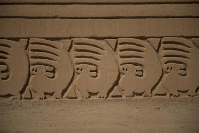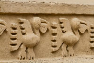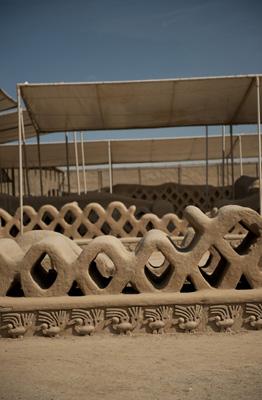 el grueso de la población vivía fuera de la ciudadela. El lugar presenta una refinada técnica arquitectónica, donde destacan impresionantes altorrelieves y exquisitos diseños geométricos y zoomorfos, frisos con líneas y figuras de peces y aves pintados originalmente en tonos ocres, amarillos y rojos.